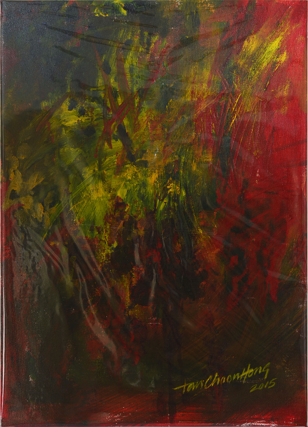 The artist says, “Through the trials and tribulations of life (represented by the dark tones), there is always the glimmer of hope (the bright spots of yellow). Just follow your dream and all will work out well (as shown in the warm red expanse).”