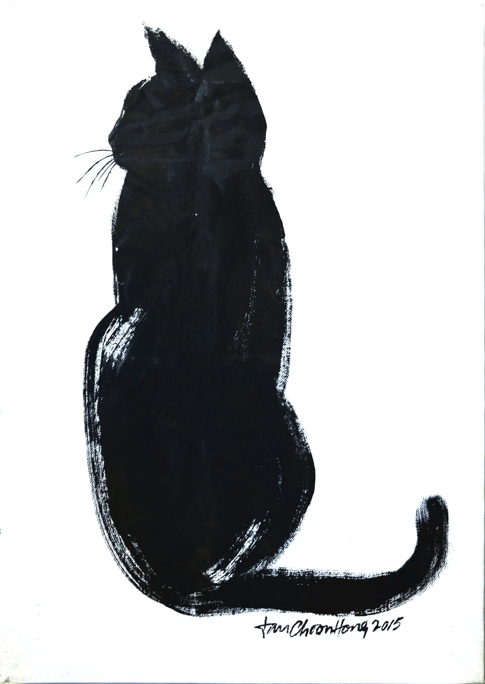 The artist used to observe an ex-neighbour’s cats and noticed a certain mystique about them, especially their close bonding with their caregivers. The artist decided to paint a black cat hoping to capture the essence of this relationship. The artist says, “The cat knows it has your unconditional love, so it sits knowing you won’t hurt it from behind. In return it surveys the scene in front, looking out for pesky intruders.”